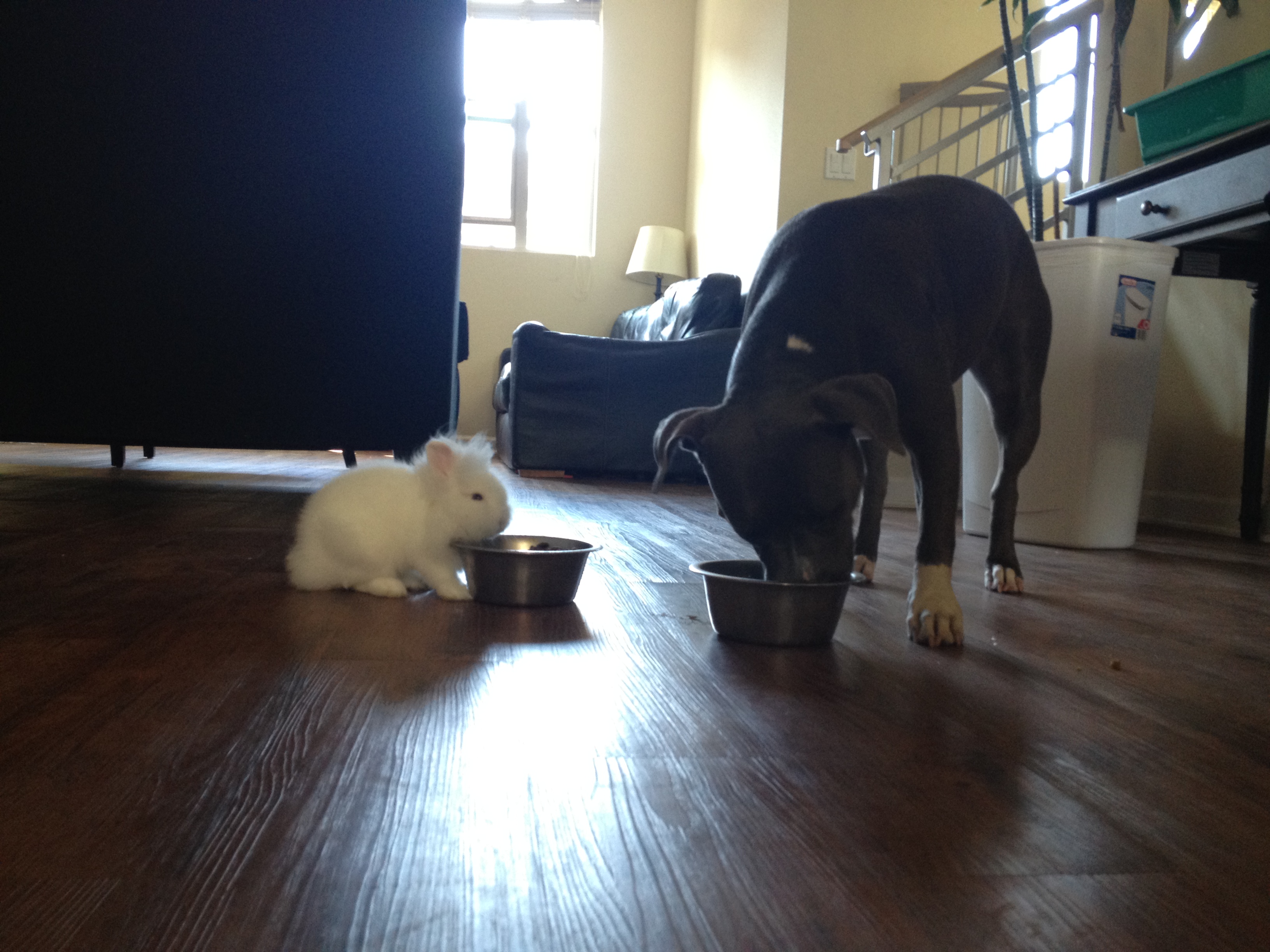 Cali a pit whom has low patience for small dogs and animals in general ( squirrels, birds, etc ) today somehow has manages to openly share her breakfast with a 2 pound lion head bunny rabbit Junior we recently adopted.What was once thought to be impossible is now an everyday reality for the Pitt. Cali is not only is now extremely patient to the bunny, she shows affectionate to him as well. This alone, challenged the stereotypes built against Cali, showing true evidence that any dog can overcome any obstacle with patience and time.