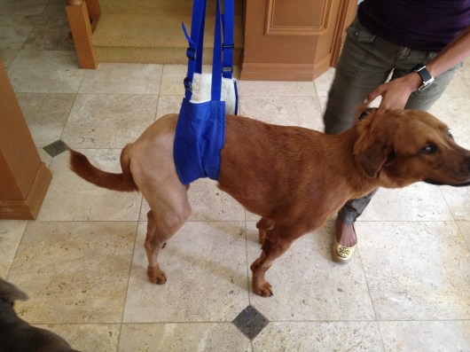In the beginning the vet said he expected Jack to be virtually immobile for at least a week or two. Well, not my Jack -“attack”. He was walking around the apartment on the first day with the assistance of the sling the vet provided us.