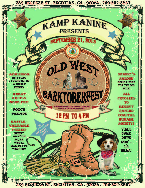 Come join Barking Beast and San Diego Doggy Daycare| Kamp Kanine Daycare to Benefit the Rancho Coastal Humane Society of the annual BARKtoberfest 2013. The pawesome event will be held Saturday September 21, 2013 from noon to 4 pm. Admission will be $5 bucks (young’ns 12 & under free!). The seasonally inspired event will host pooch parade games for the kids, a prize wheel raffle, and a silent auction with fantastic valuable prizes!
