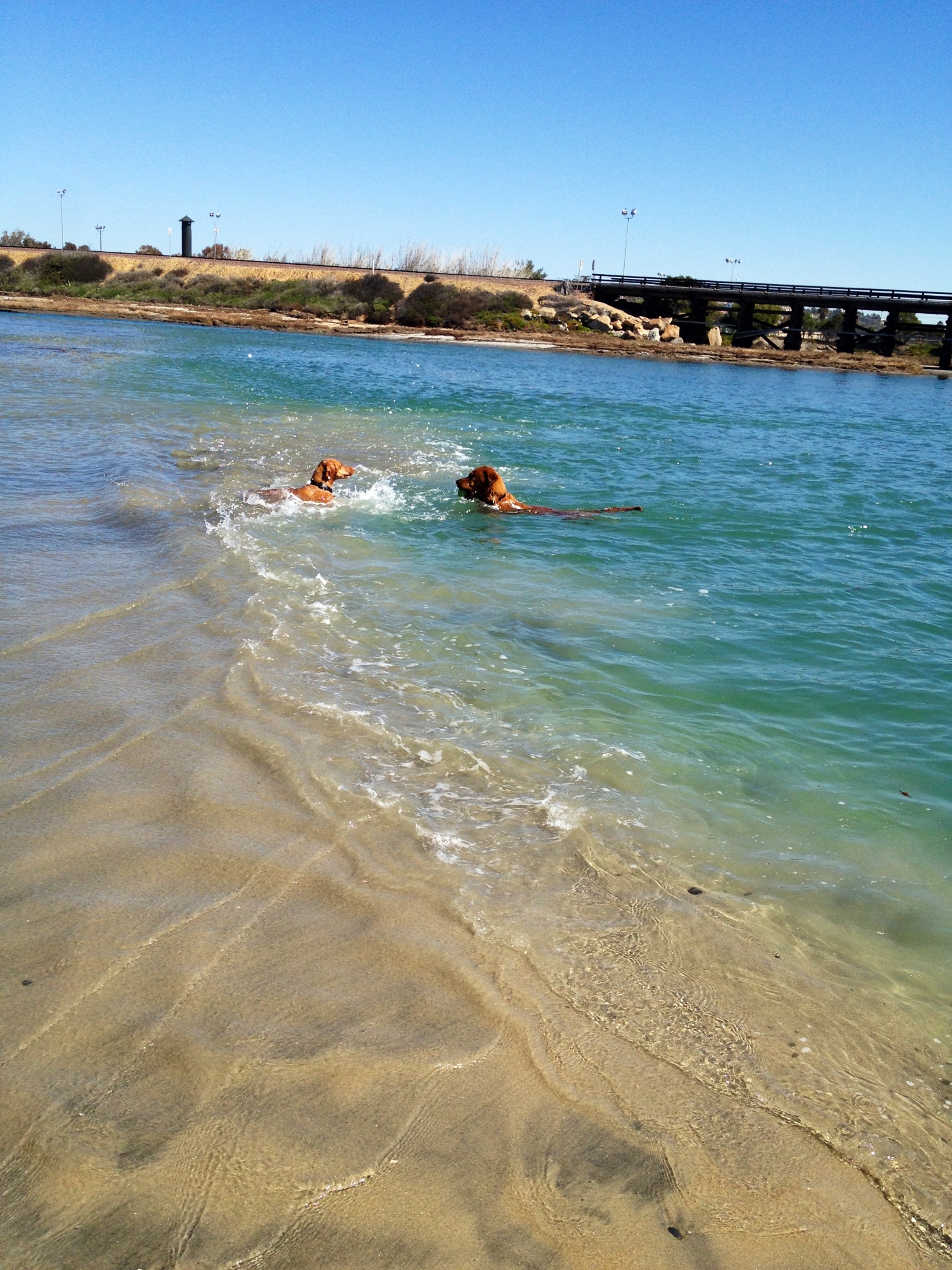 What is fun about the south side of the beach is the multiple swim features it offers dogs. Separating the north and south sections of the beach is where the mouth of the lagoon meets the ocean. The current flowing in and out of the lagoon offers a stimulating swim for pups. You  can access the lagoon from the west side of the bridge. This side of the beach also has waves and the calm waters of the lagoon for swimming and playing.